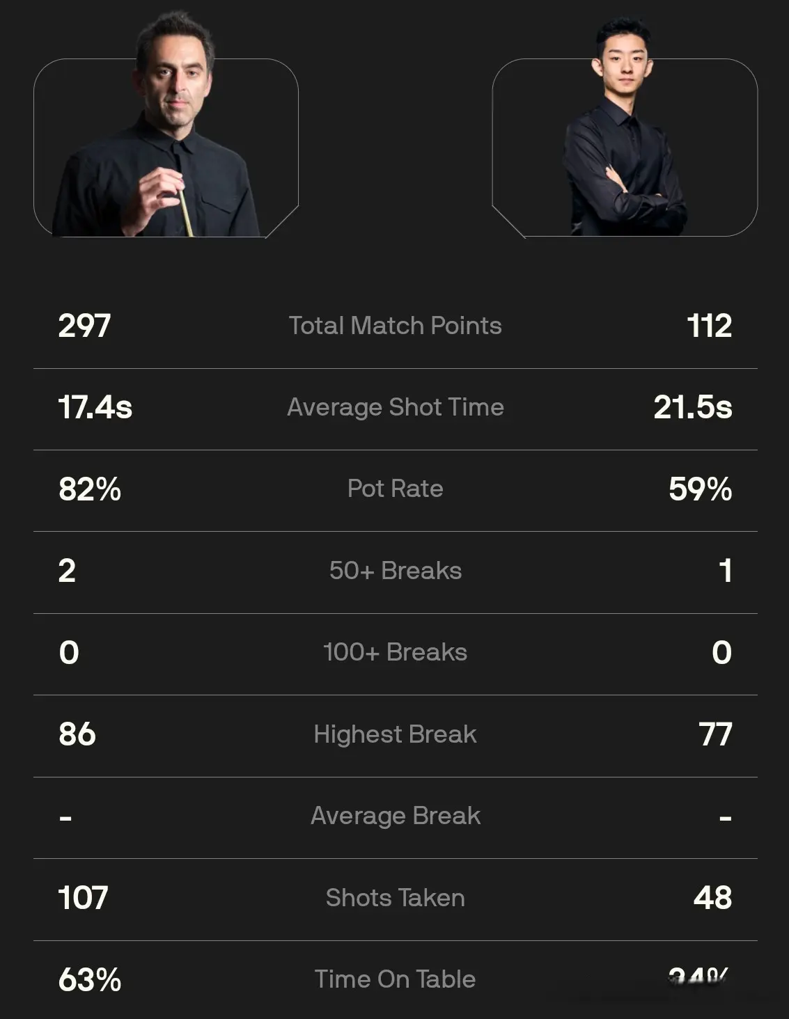 吴宜泽上手拿到16分后尝试进攻失误,奥沙利文上手拿到45分后选择防守。吴宜泽再拿8分防守失误,奥沙利文打进右侧顶袋红球上手并最终以77:24拿下此局成功取得1-0的领先。